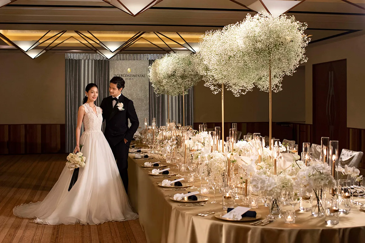 空間が語る、おふたりの美意識。 一日一組、アートを纏うプライベート・ウエディング。インターコンチネンタルホテル大阪が提案するのは、おふたりのためだけに設えられた、唯一無二の装飾空間。 厳選された花材、計算し尽くされたライティング。おふたりのストーリーを、季節の花々と洗練された調度品で描き出し、最高峰のホスピタリティと共に、記憶に刻まれる一日を提供いたします。